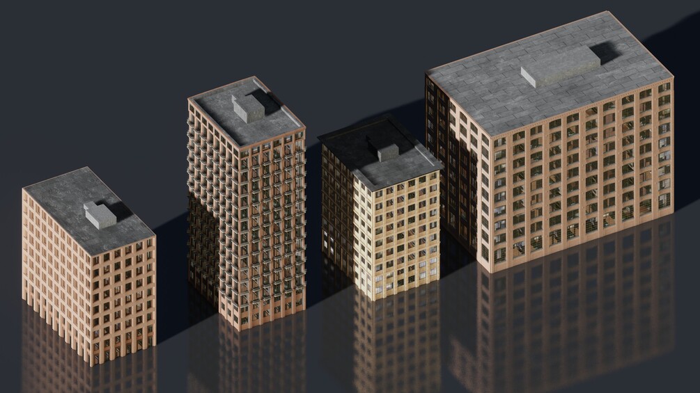The buildings are useful for scattering large scenes with many instances, and also have enough detail for closeup shots. The sizes are typical of floor to floor heights and buildings found in large cities.